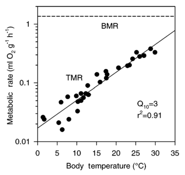 Fig. 1. Metabolic rates measured as oxygen consumption of torpid thermoconforming small hibernator, the bat (Nyctophilus geoffroyi), as a function of body temperature. Note the intercept with the normothermic body temperature of 35°C of the extrapolation of TMR is 40% below the BMR (Geiser, 2004).